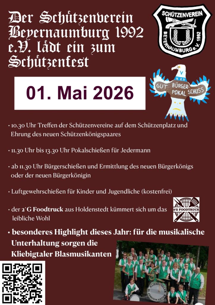 Am 01. Mai 2026 veranstalten wir wie jedes Jahr unser Schützenfest. Wir freuen uns auf viele Besucher – ob Schützen oder Bürger -, die an diesem Tag gemeinsam mit uns feiern wollen.